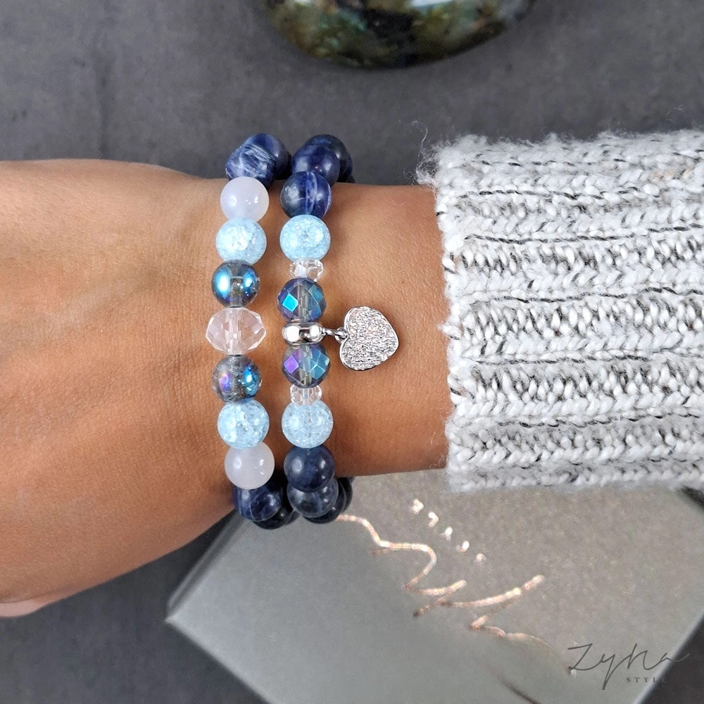Szodalit ásvány karkötő szett akva aurakvarccal, fehér acháttal és hegyikristállyal.