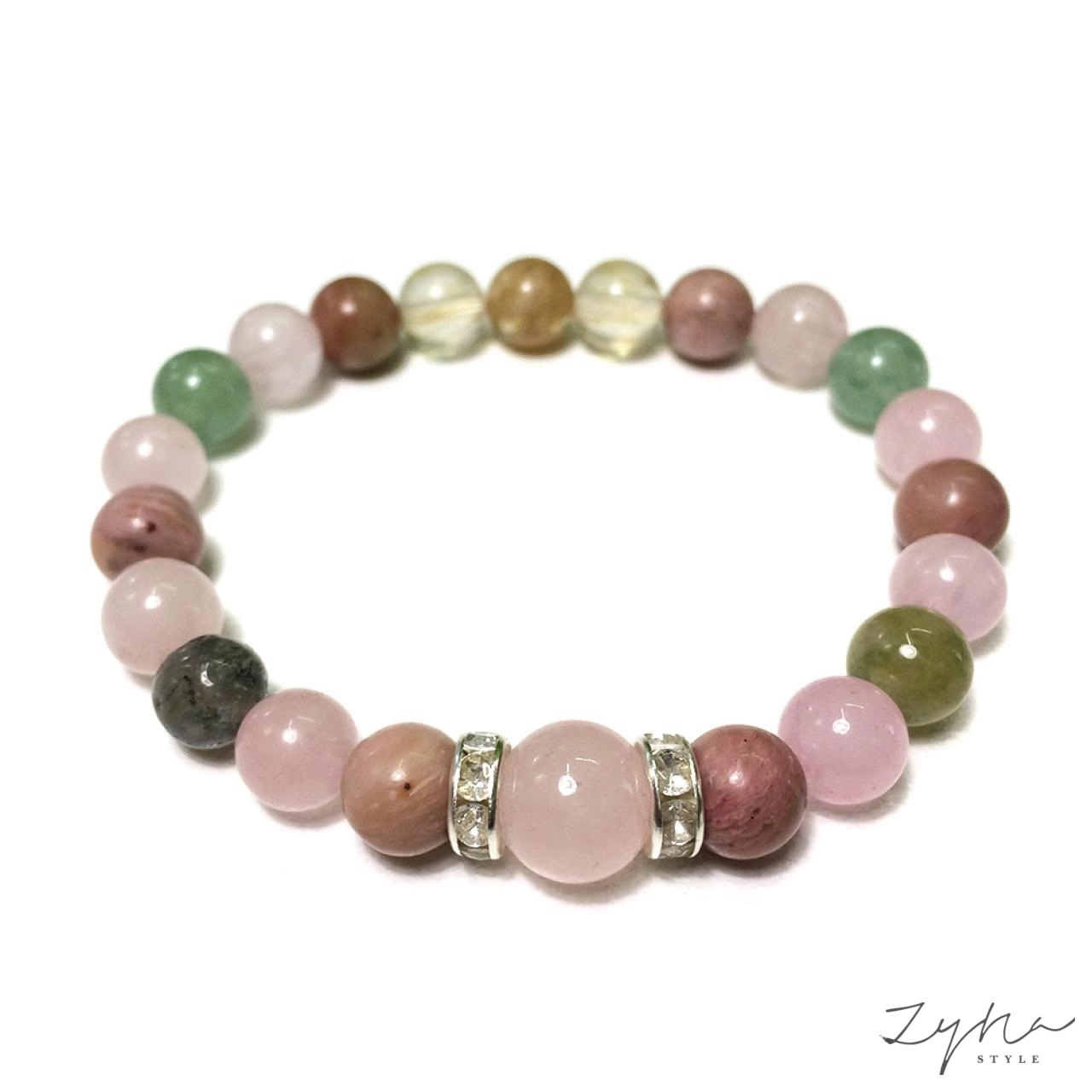 Rózsakvarc, achát, citrin kövekből összeállított ásvány karkötő.