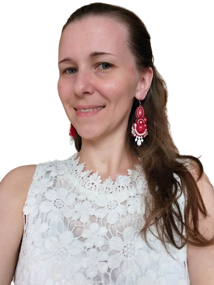 “Egy igazán vidám, élettel teli fülbevalót készítettem piros színű valódi porcelán lencsék felhasználásával. A lencséket apró kásagyöngyökkel varrtam körbe, és további golyógyöngyökkel díszítettem. Alulról többféle lógó is csatlakozik a fülbevalóhoz. Hátát piros műbőrrel fedtem be, és nemesacél kampós akasztóval láttam el, mely nem allergizál.”