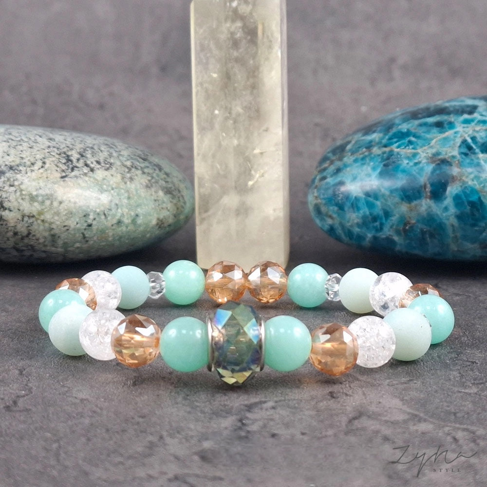 Nagyon színes, pozitív ásvány karkötő boldogság érzés fokozására, depresszió és szorongás csökkentésére. A karkötőbe gyönyörű zöld amazonit, fazettált topáz aura kvarc, roppantott hegyikristály és matt zöld kvarcit található.