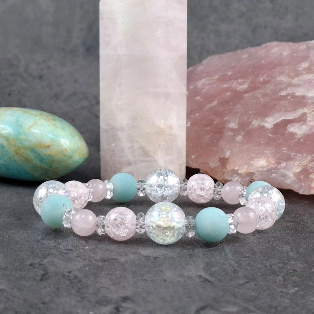 Ásvány karkötő gyönyörű pasztell színekben. A karkötő roppantott angyal aura kvarcból, rózsakvarcból, matt zöld kvarcittal készült.