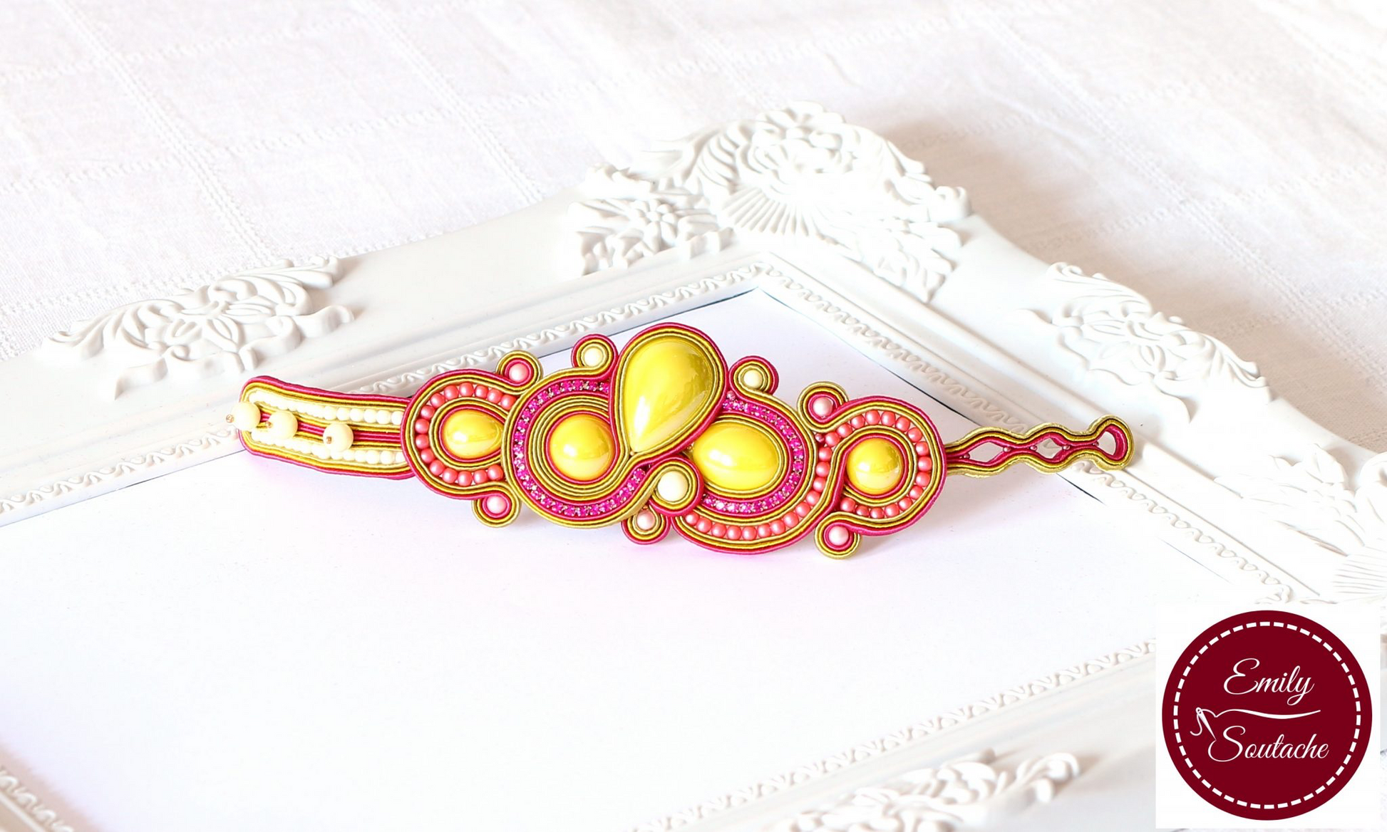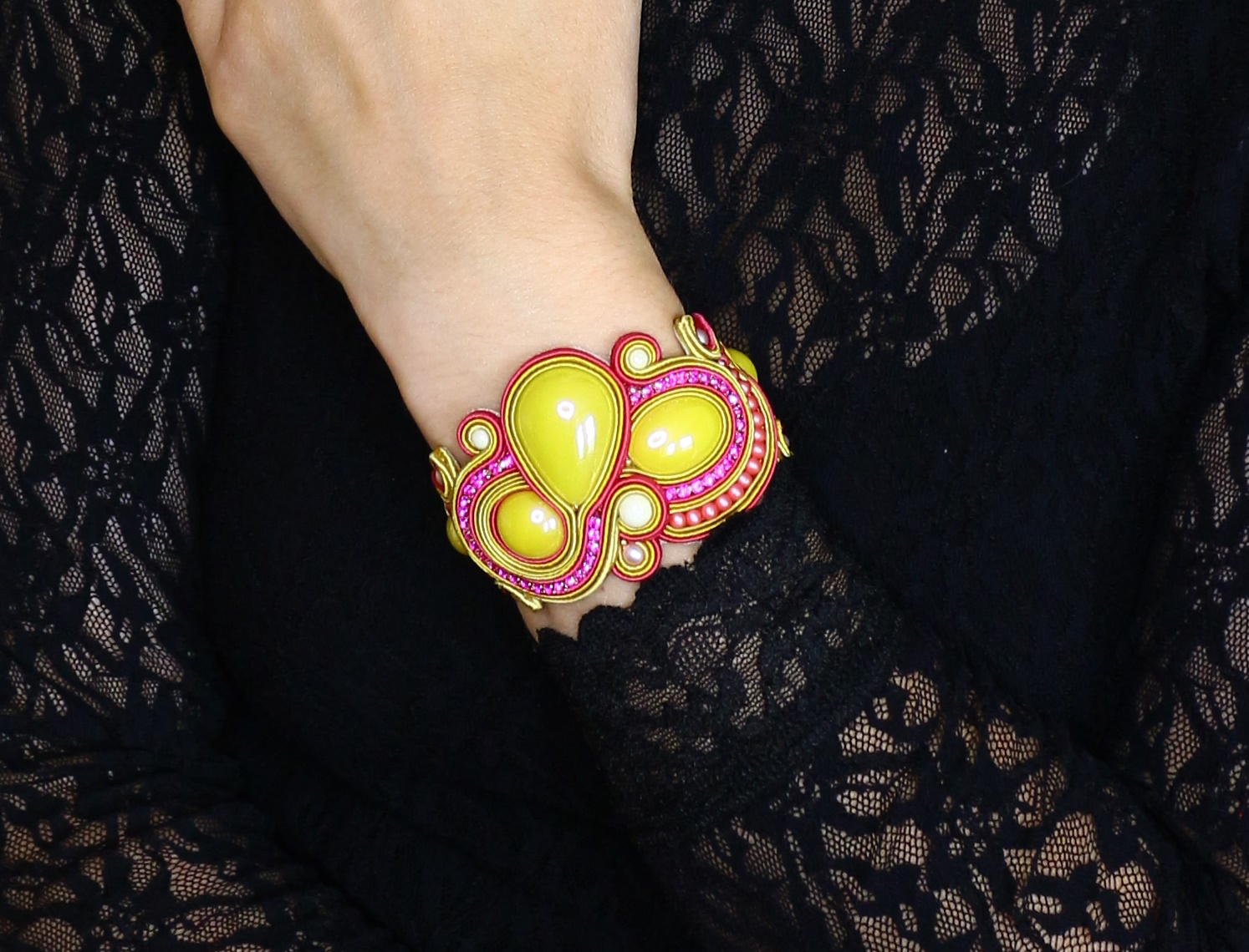 “A sujtás karkötőt számos porcelán lencse díszíti, amiket hol strasszlánccal, hol gyöngyökkel varrtam körbe. A karkötő három állásos, így több csuklómérethez is igazítható: 15 / 16.5 / 18 cm. A karkötő teljesen fémmentes, ezért nem kell tartani allergiás tünetektől. Az ékszert 3 nagyobb golyógyönggyel lehet rögzíteni. Ha nem milliméterre pontosan egyezik a hölgyek csuklóméretével az adott állás, sem kell aggódni, mert a nagyobb egybefüggő sujtás dísz miatt nem tud körbeforogni a karkötő. A hátát halvány rózsaszín textilbőrrel fedtem be.”