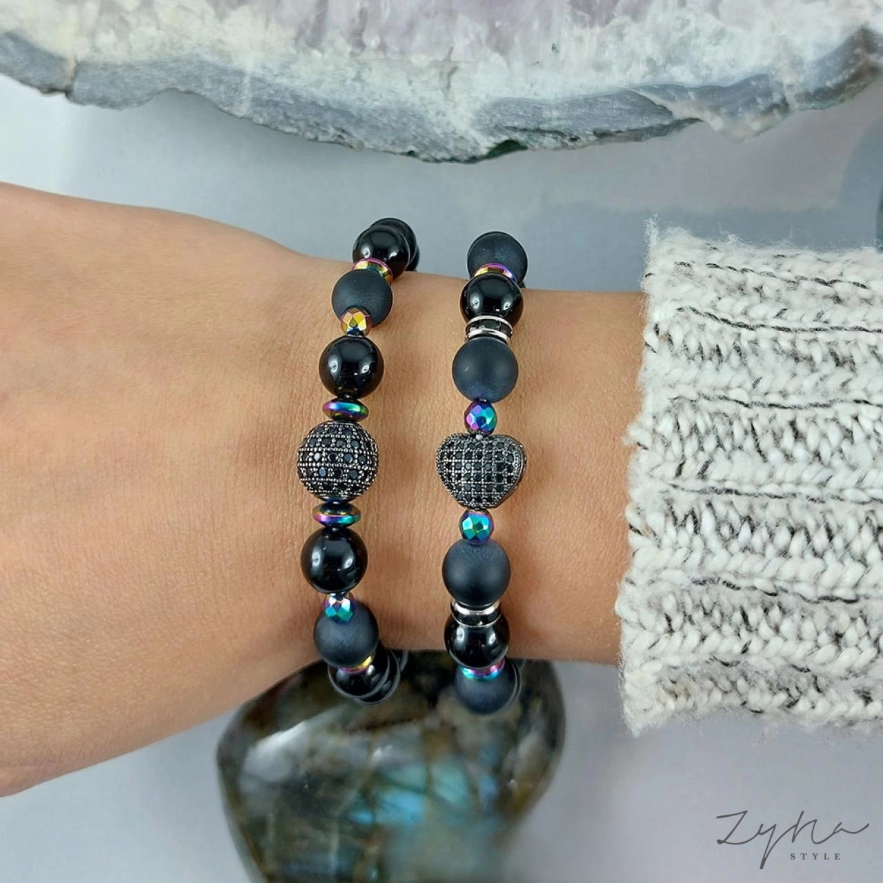 Ónix, színezett hematit, matt ónix fekete cirkónia ásvány karkötő szett.