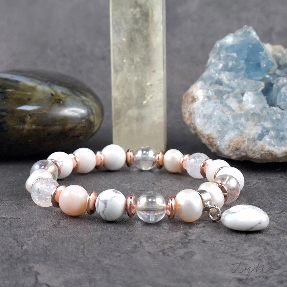 Gyönyörű rosegold, fehér ásvány karkötő howlit szív medállal.