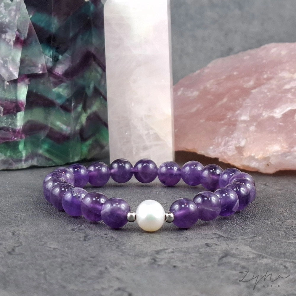 Lelki egyensúly, koncentráció, spiritualitás fejlesztése ametiszt ásvány karkötő tenyésztett gyönggyel