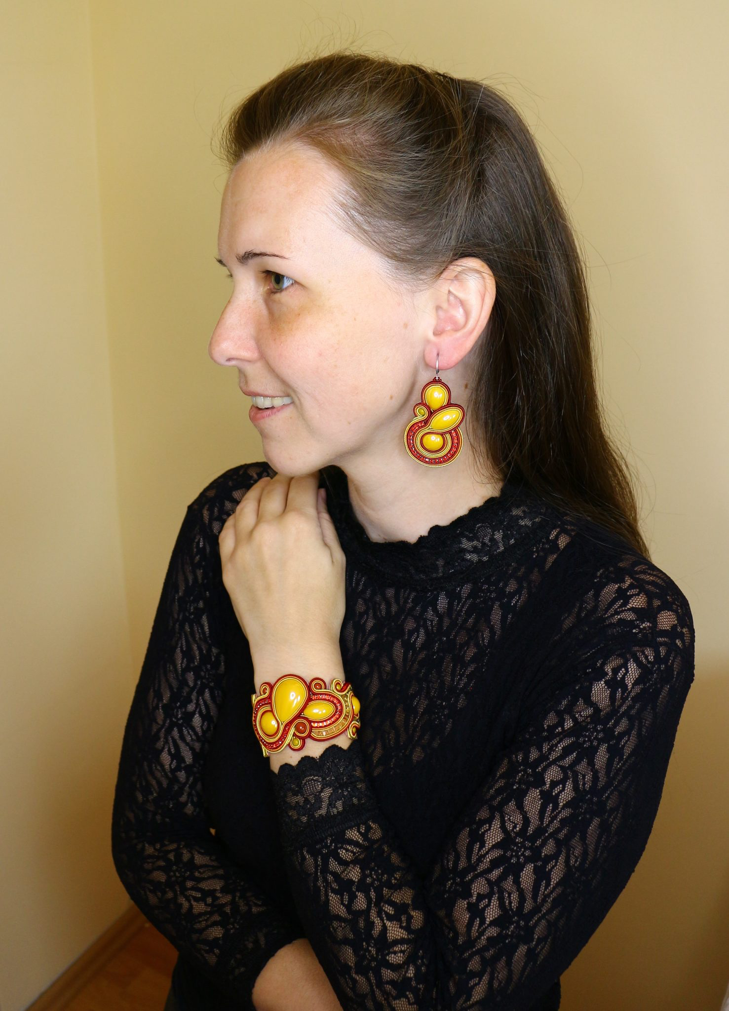 “A sujtás karkötőt számos porcelán lencse díszíti, amiket hol strasszlánccal, hol gyöngyökkel varrtam körbe. A karkötő három állásos, így több csuklómérethez is igazítható: 15 / 16.5 / 18 cm. A karkötő teljesen fémmentes, ezért nem kell tartani allergiás tünetektől. Az ékszert 3 nagyobb jáspis ásványgyönggyel lehet rögzíteni. Ha nem milliméterre pontosan egyezik a hölgyek csuklóméretével az adott állás, sem kell aggódni, mert a nagyobb egybefüggő sujtás dísz miatt nem tud körbeforogni a karkötő. A hátát barna valódi bőrrel fedtem be.”