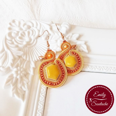 “Egy klasszikus formájú, arany és réz színű fülbevalót készítettem. Pasztell sárga színű, kerámia alapú, mozaik darabok felhasználásával készült a fülbevaló, amihez rózsa arany színű, nemesacél kampós akasztót rögzítettem, mely nem allergizál, és nem színeződik el.”
