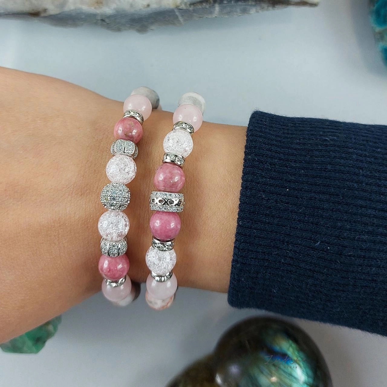 Ásvány karkötő szett rózsaszín roppantott hegyikristállyal, rodonittal, rózsakvarccal, matt pink zebra jáspissal.