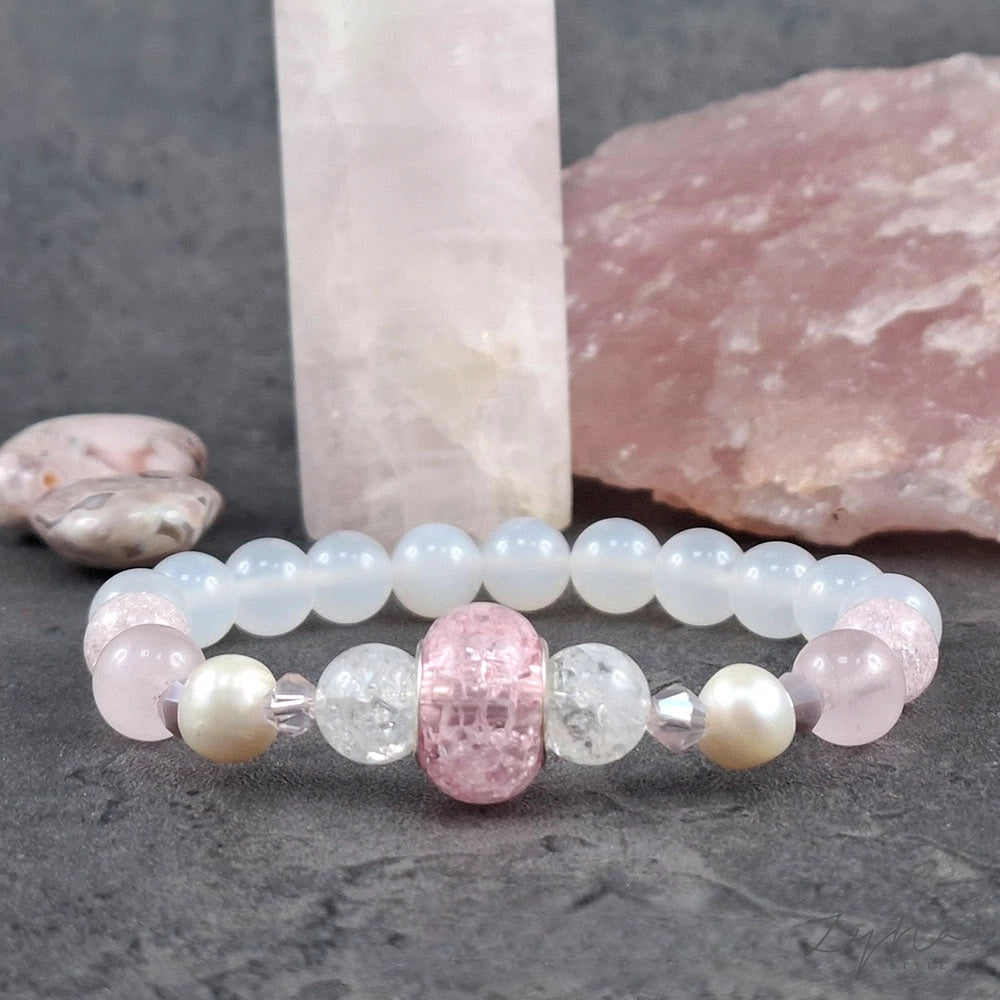 Ásvány karkötő tenyésztett gyönggyel, rózsakvarccal, hegyikristállyal és fehér acháttal.