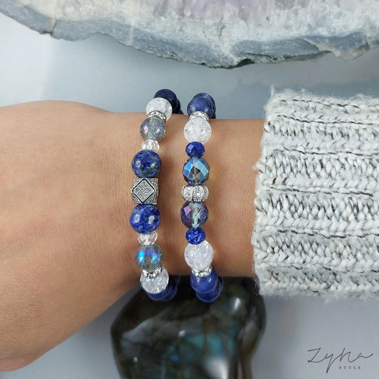 Akva aura kvarc, lapis lazuli, hegyikristály, szodalit ásvány karkötő szett cirkónia köztesekkel.