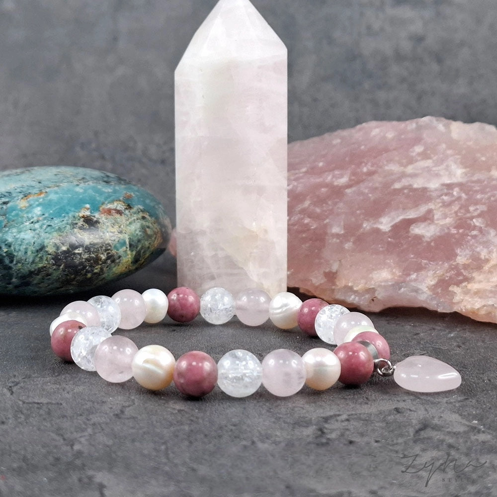 Ásvány karkötő rózsakvarc szív medállal és gyönyörű édesvizi tenyésztett gyönggyel.