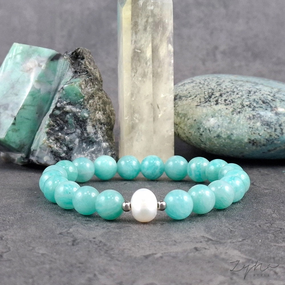 Lelkierő, akaraterő növelő, lelki egyensúlyt támogató amazonit ásvány karkötő tenyésztett gyönggyel