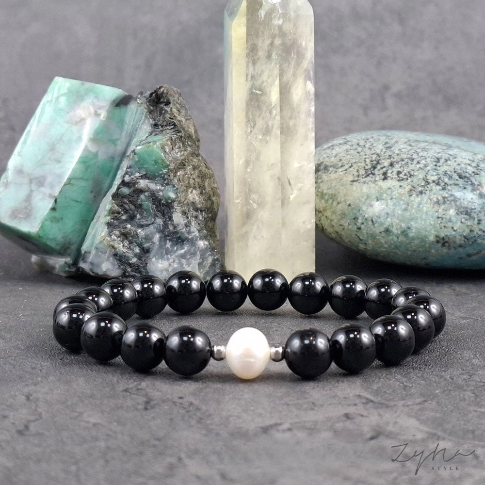 Stabilitást, kitartást, védelmet növelő, energetizáló ónix ásvány karkötő tenyésztett gyönggyel