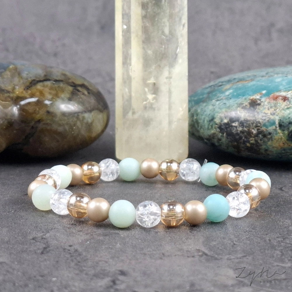 6mm-es ásvány karkötő matt zöld kvarcittal, napfény aura kvarccal, roppantott hegyikristállyal és bézs majolika gyönggyel.