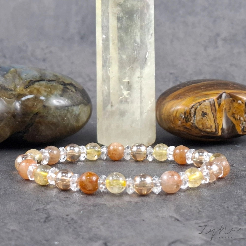 Gyönyörű csillogó 6mm-es szerencsehozó ásvány karkötő, aura kvarccal és ragyogó napkővel.