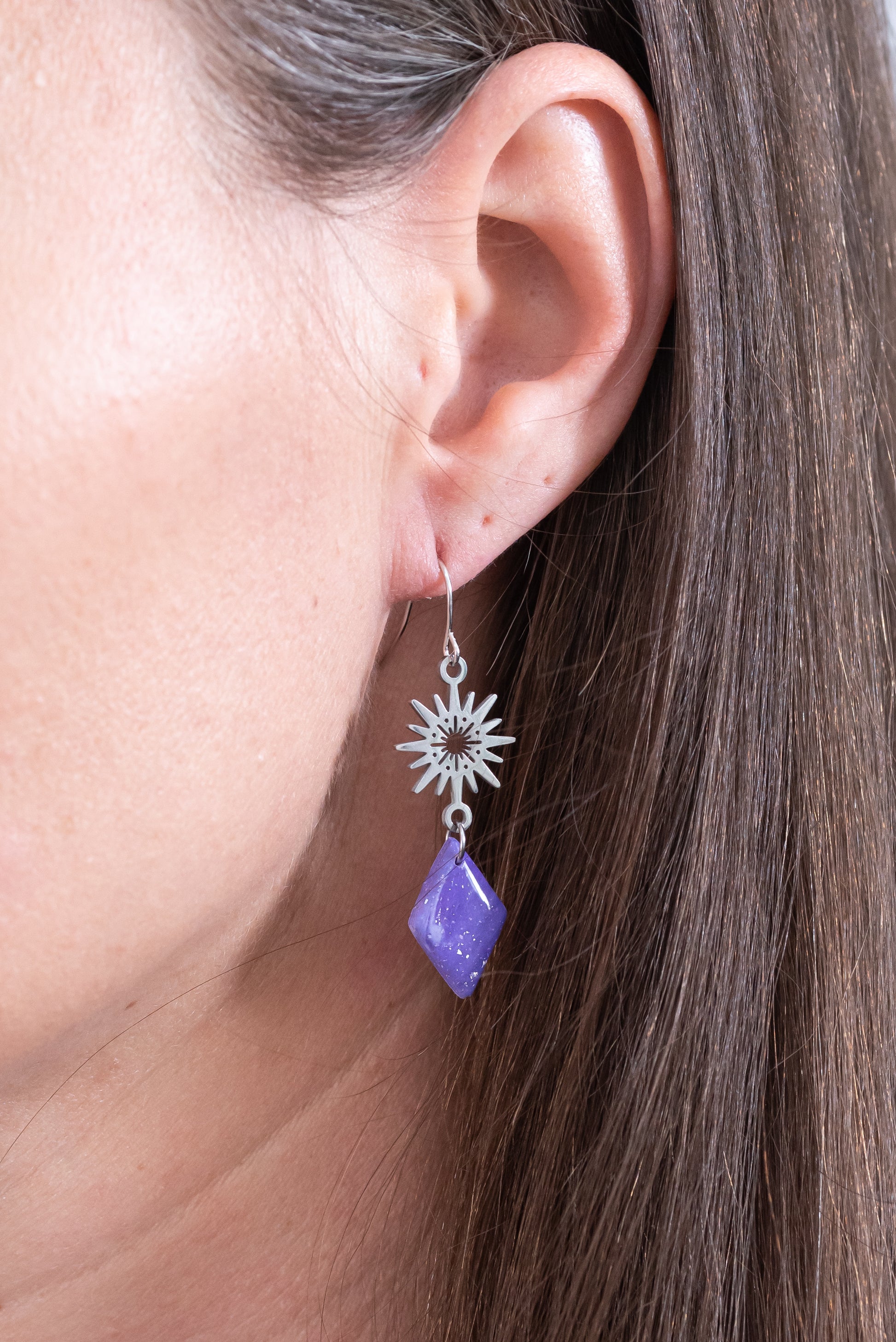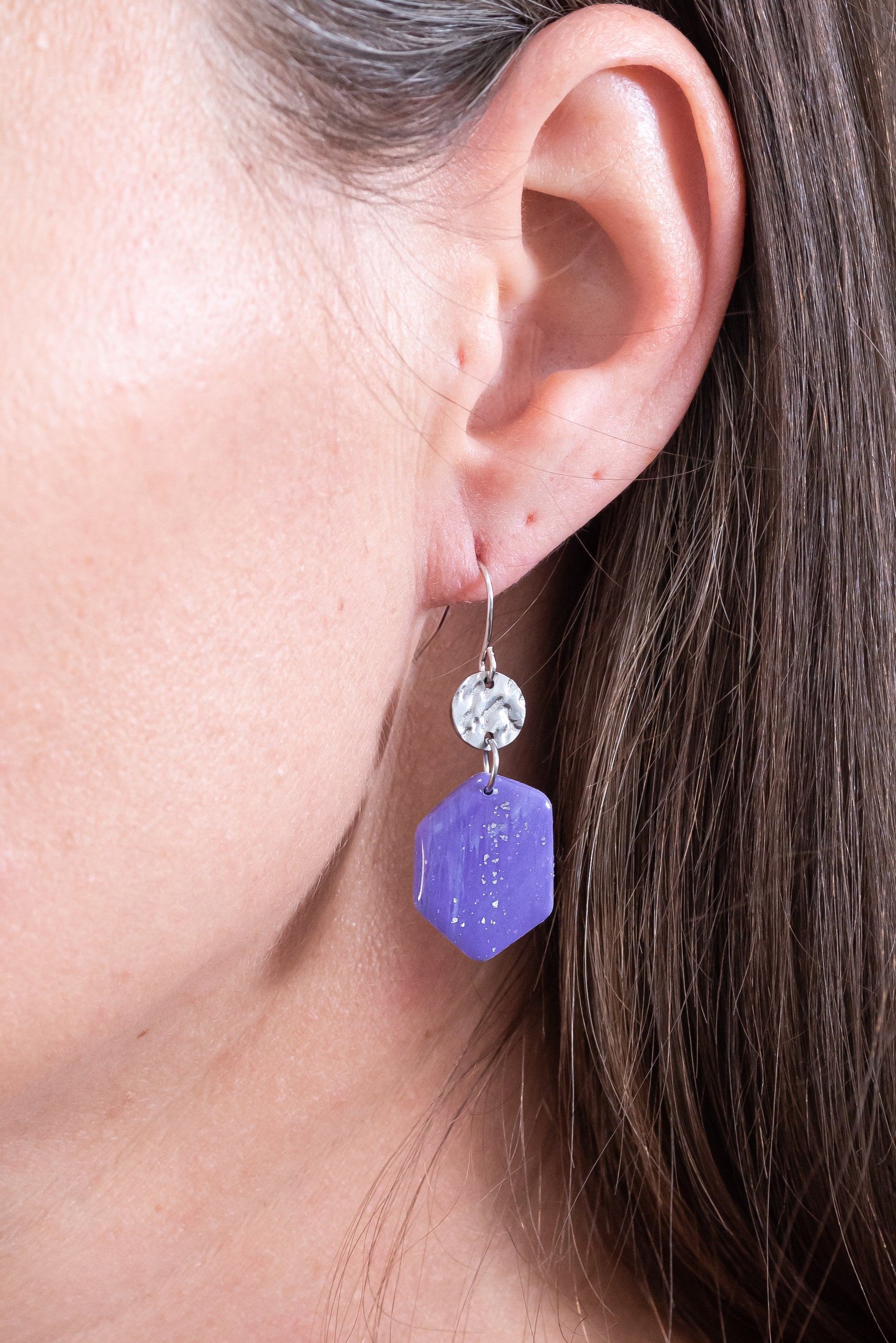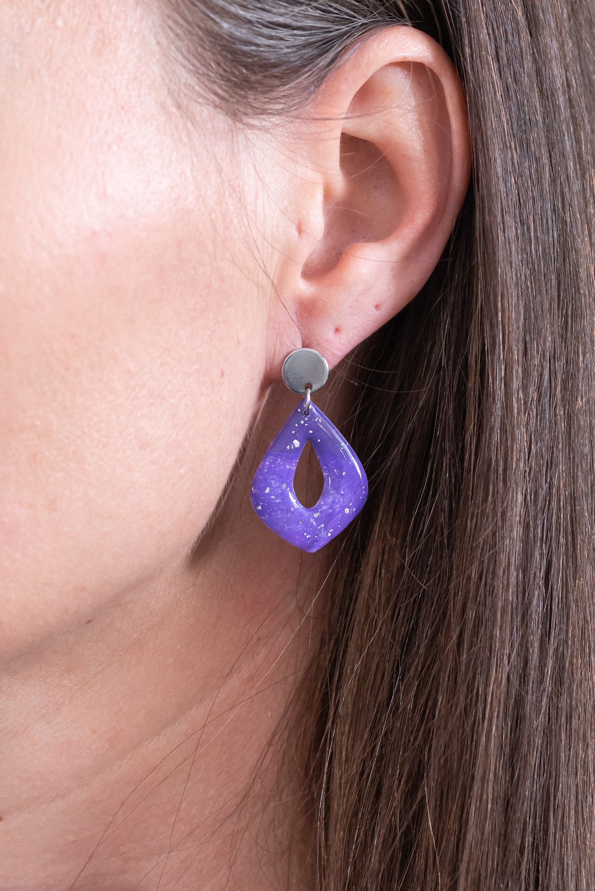 Violetta nagyobb csüngős fülbevaló többféle formában, márványos lila színben